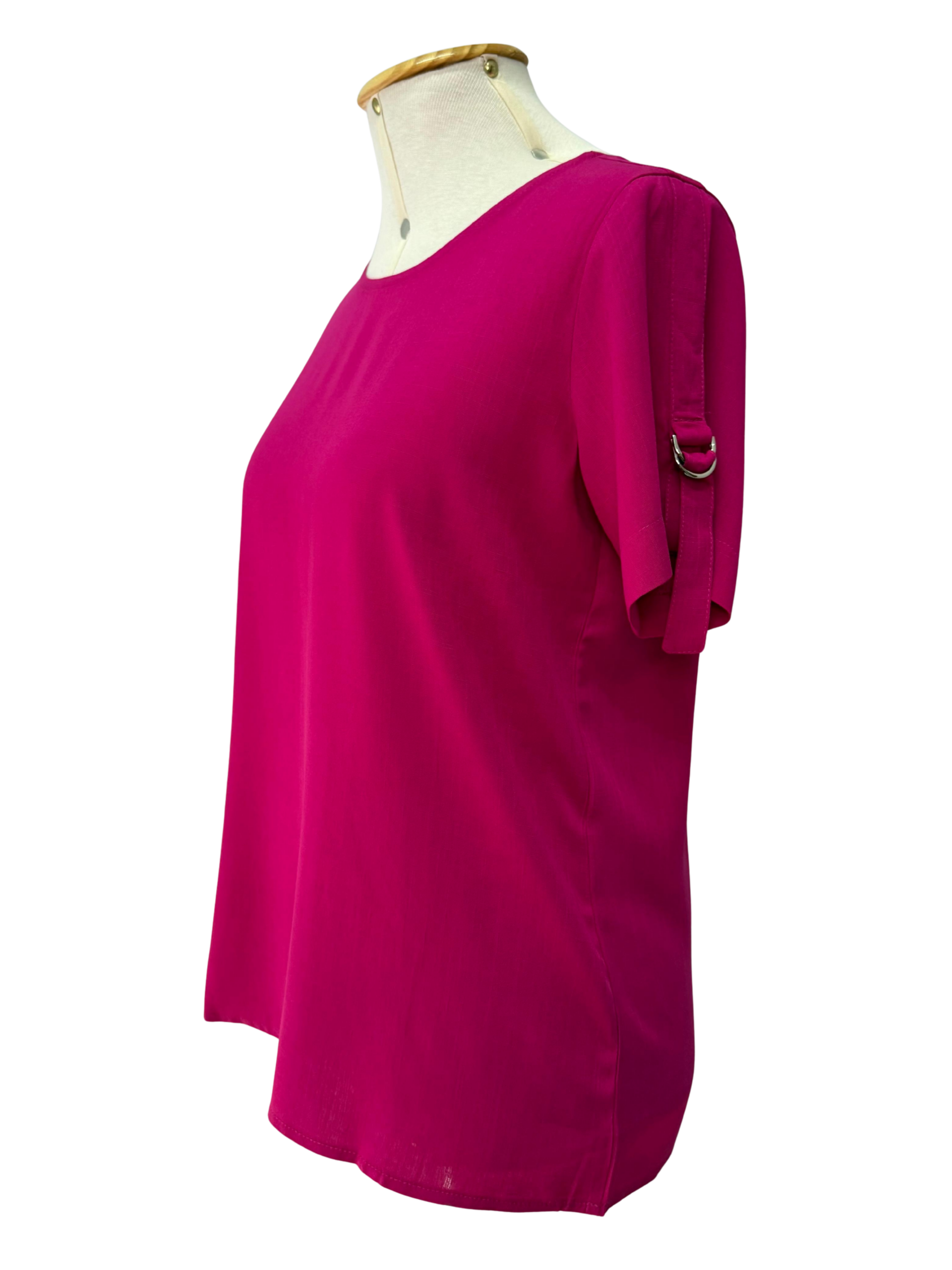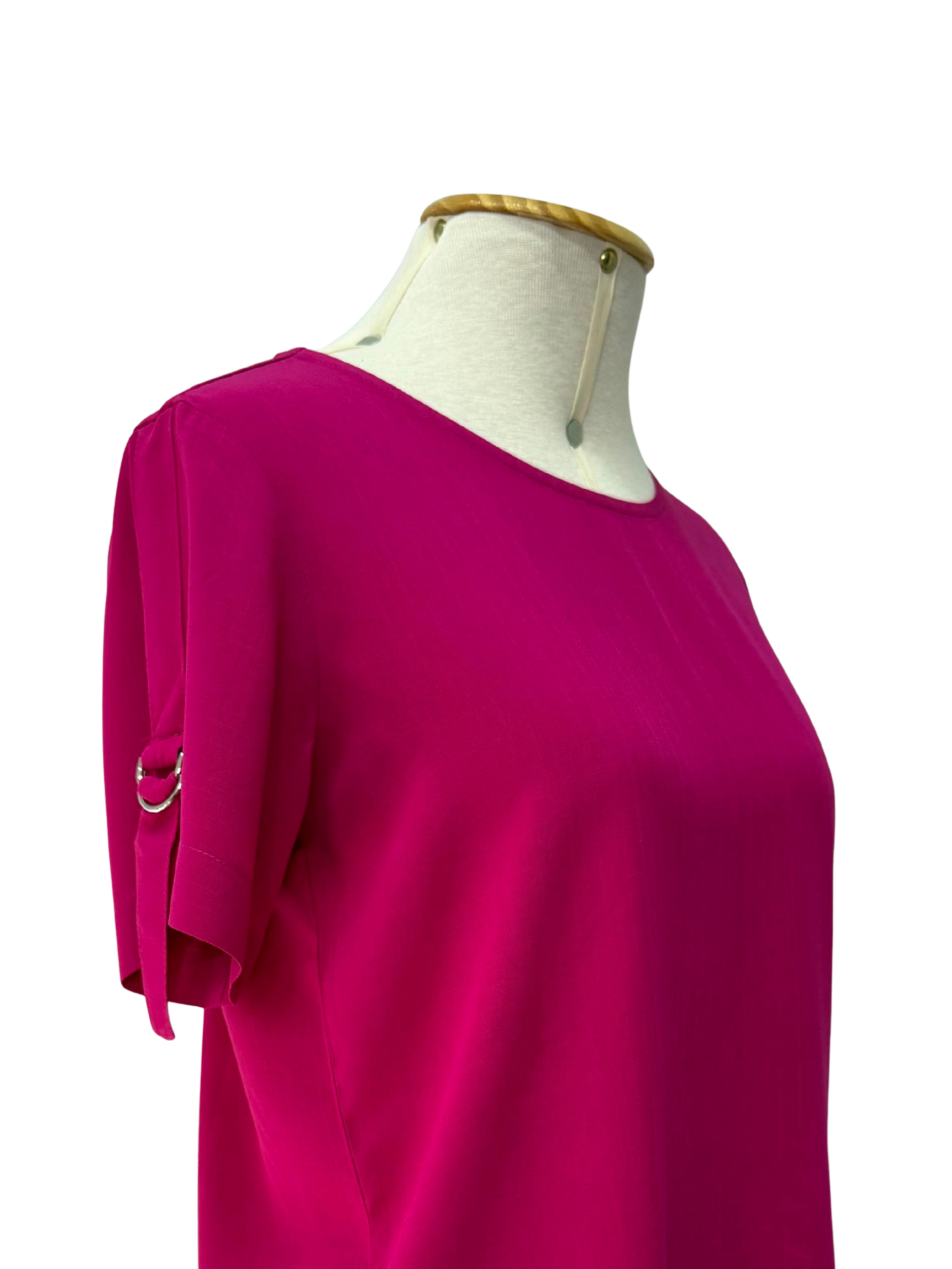 Confeccionada em tecido leve e confortável, possui modelagem reta e gola redonda, garantindo caimento soltinho e moderno. O diferencial fica por conta do detalhe com argola metálica na manga, que adiciona um toque de estilo e personalidade à peça.