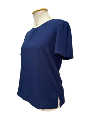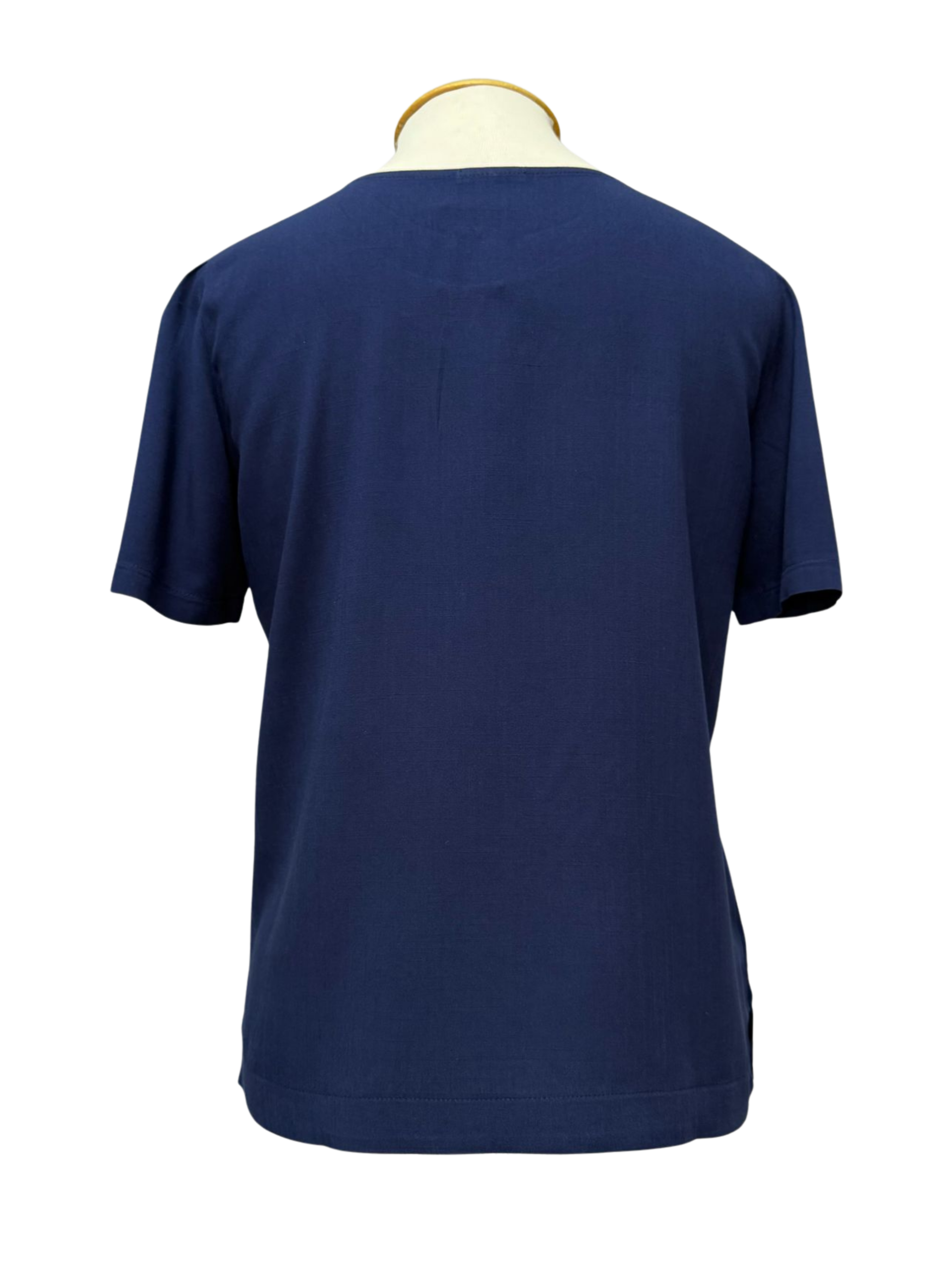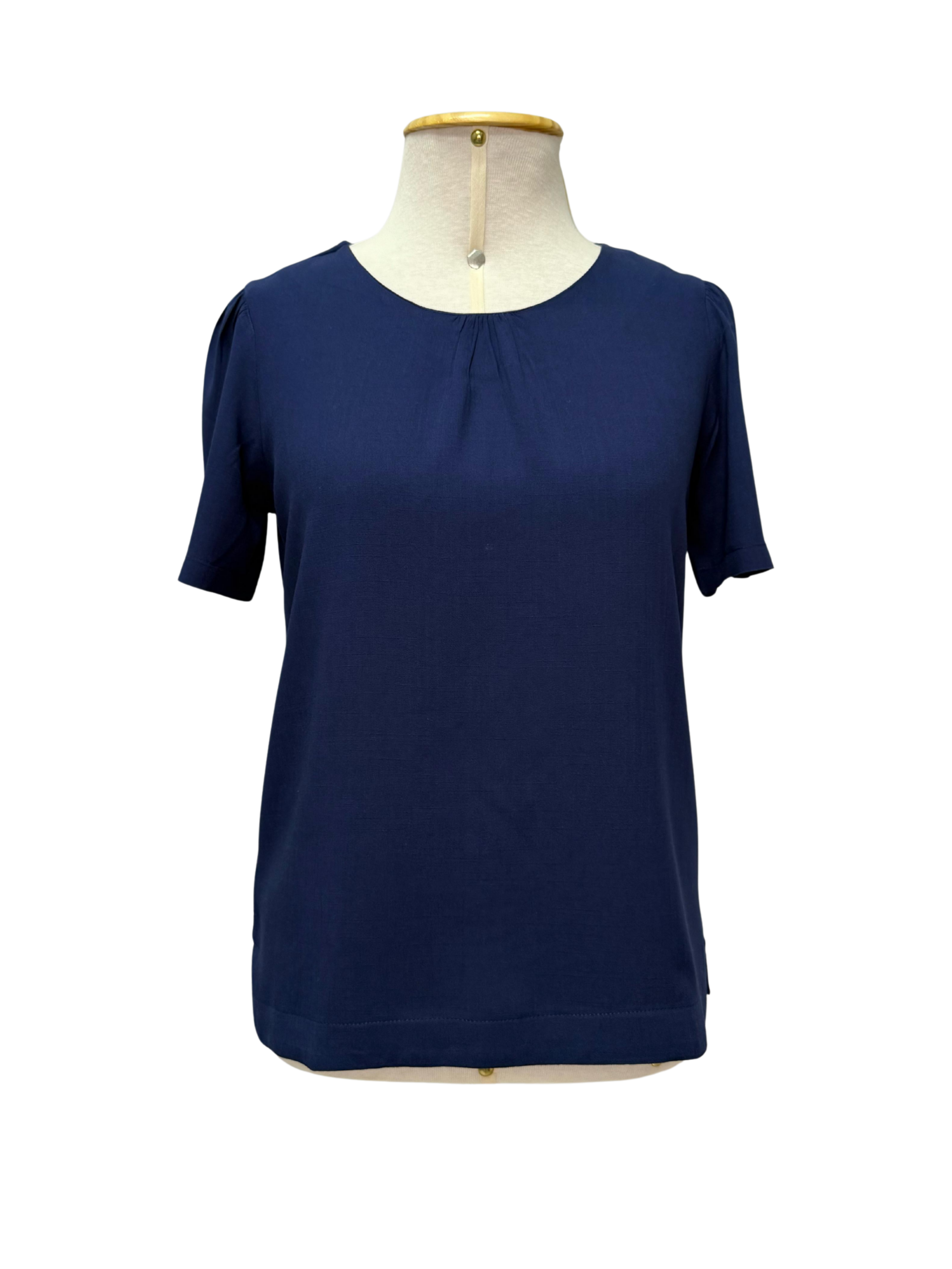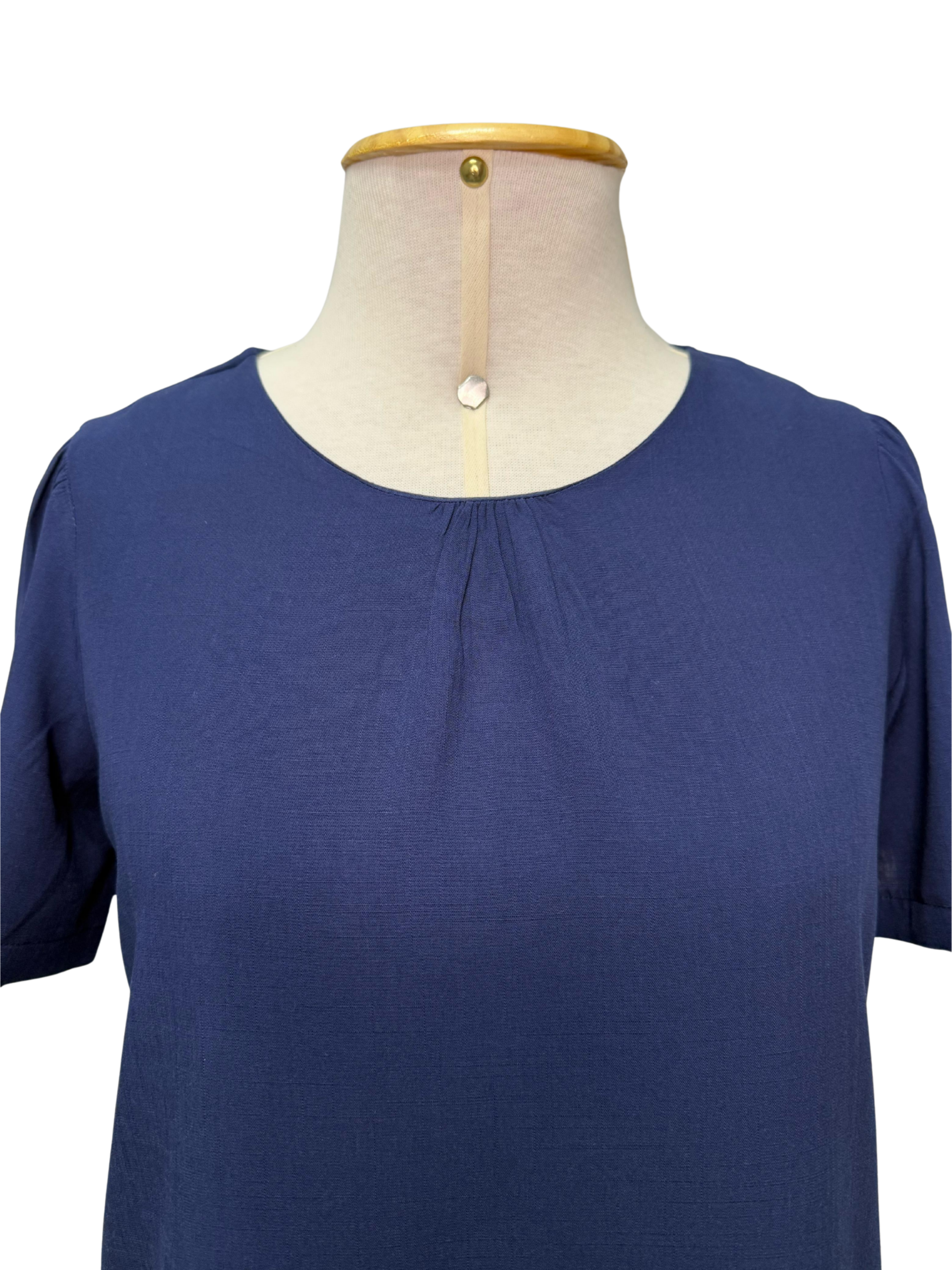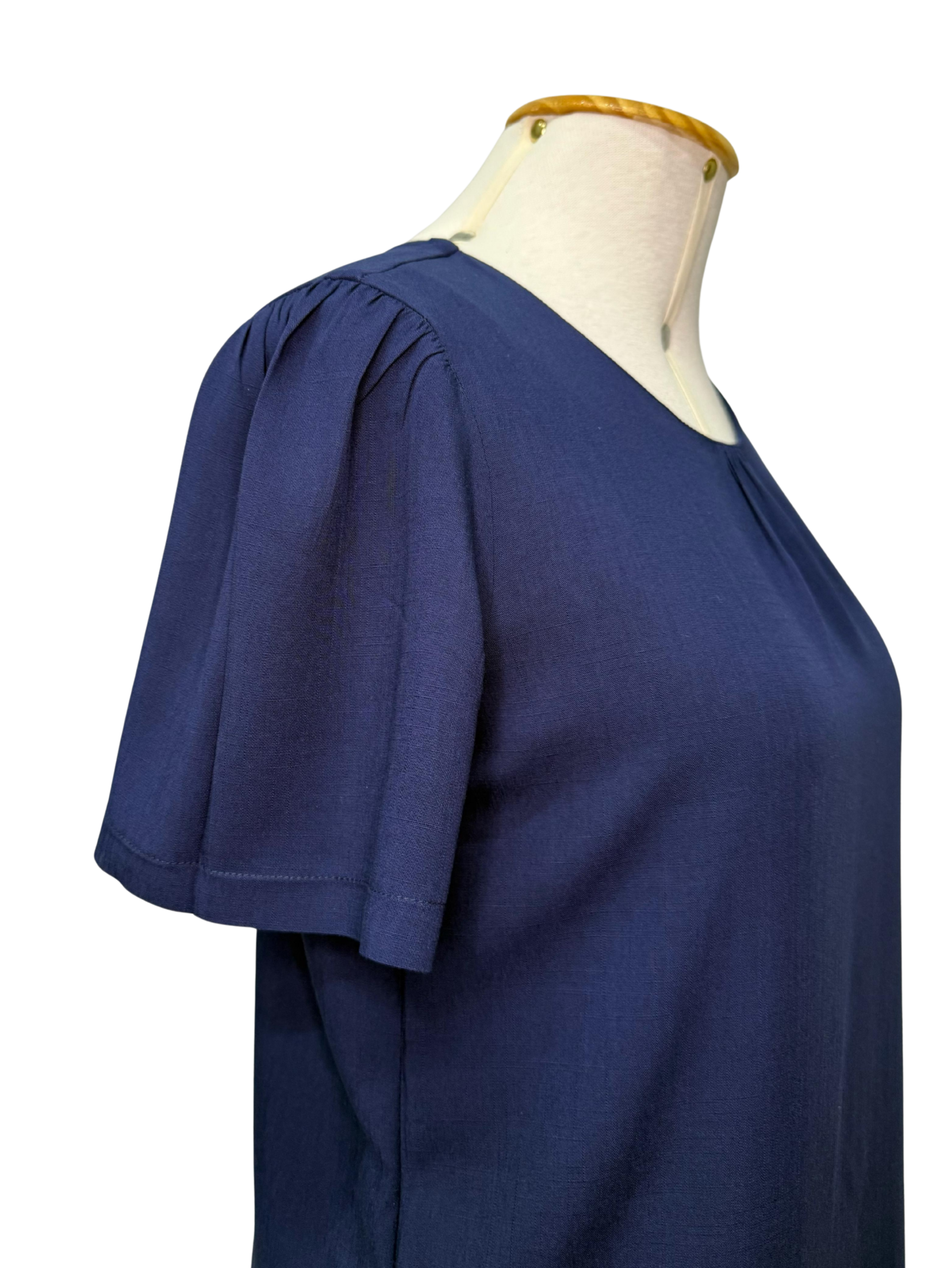 Na cor azul, possui modelagem reta e caimento solto no corpo, garantindo conforto e elegância. O decote é redondo com leve franzido, adicionando um toque delicado ao visual. As mangas curtas contam com pequenos franzidos nos ombros, proporcionando um charme sutil e pequenas aberturas nas laterais da barra.