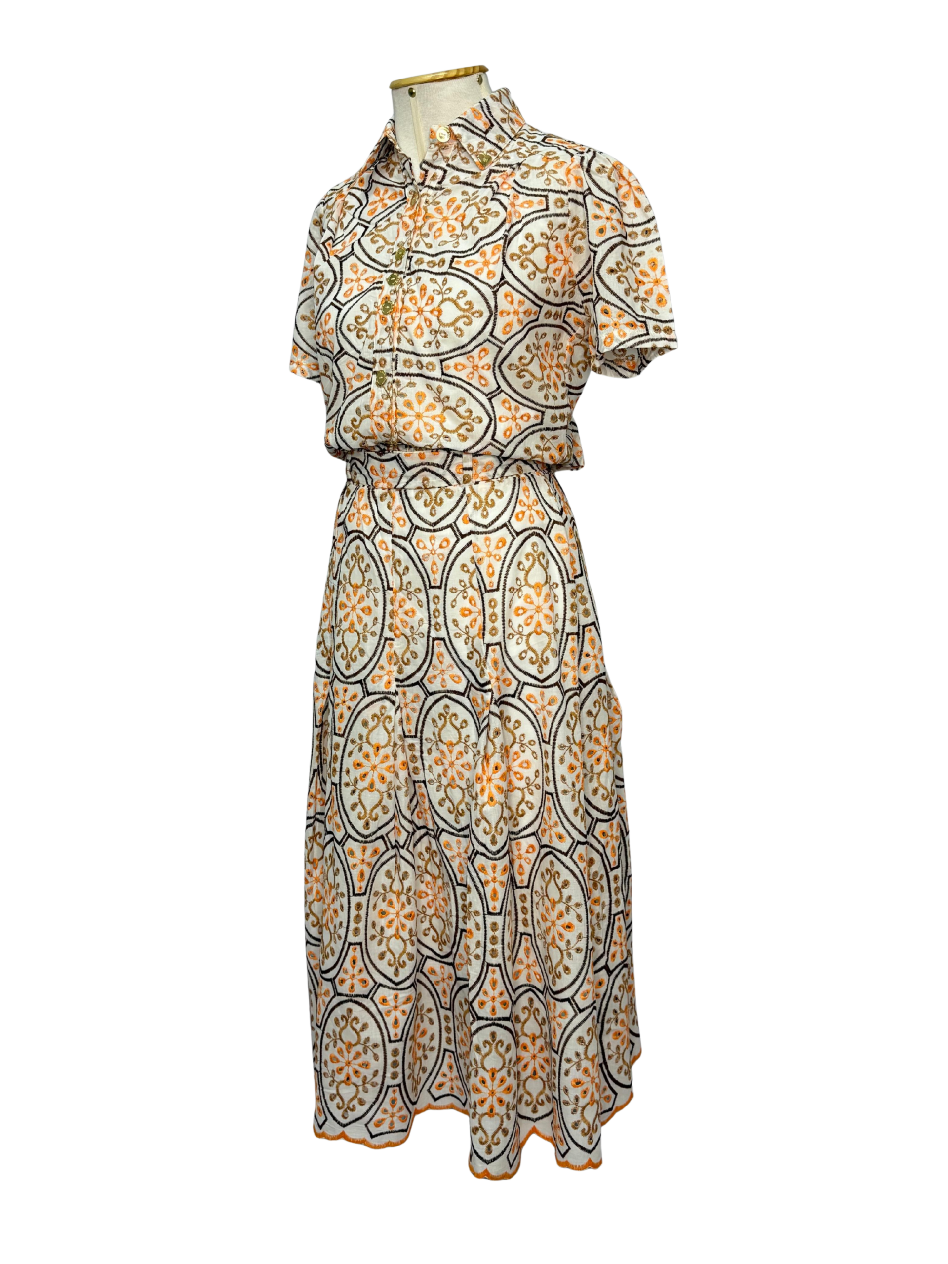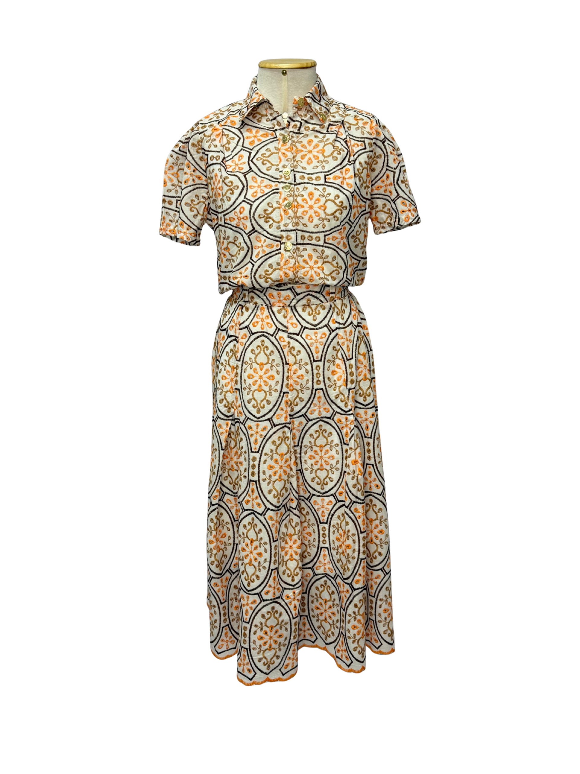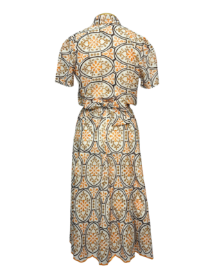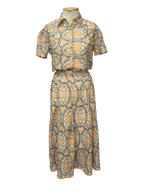 Conjunto em laise estruturada, com estampa geométrica floral em tons de laranja, creme e dourado. Acompanha quatro peças: blusa com gola e botões dourados, saia midi com caimento fluido, regata branca para uso interno e cinto no mesmo tecido para ajuste da cintura. O conjunto oferece um visual elegante, delicado e muito versátil — perfeito para eventos, trabalho ou composições sofisticadas.