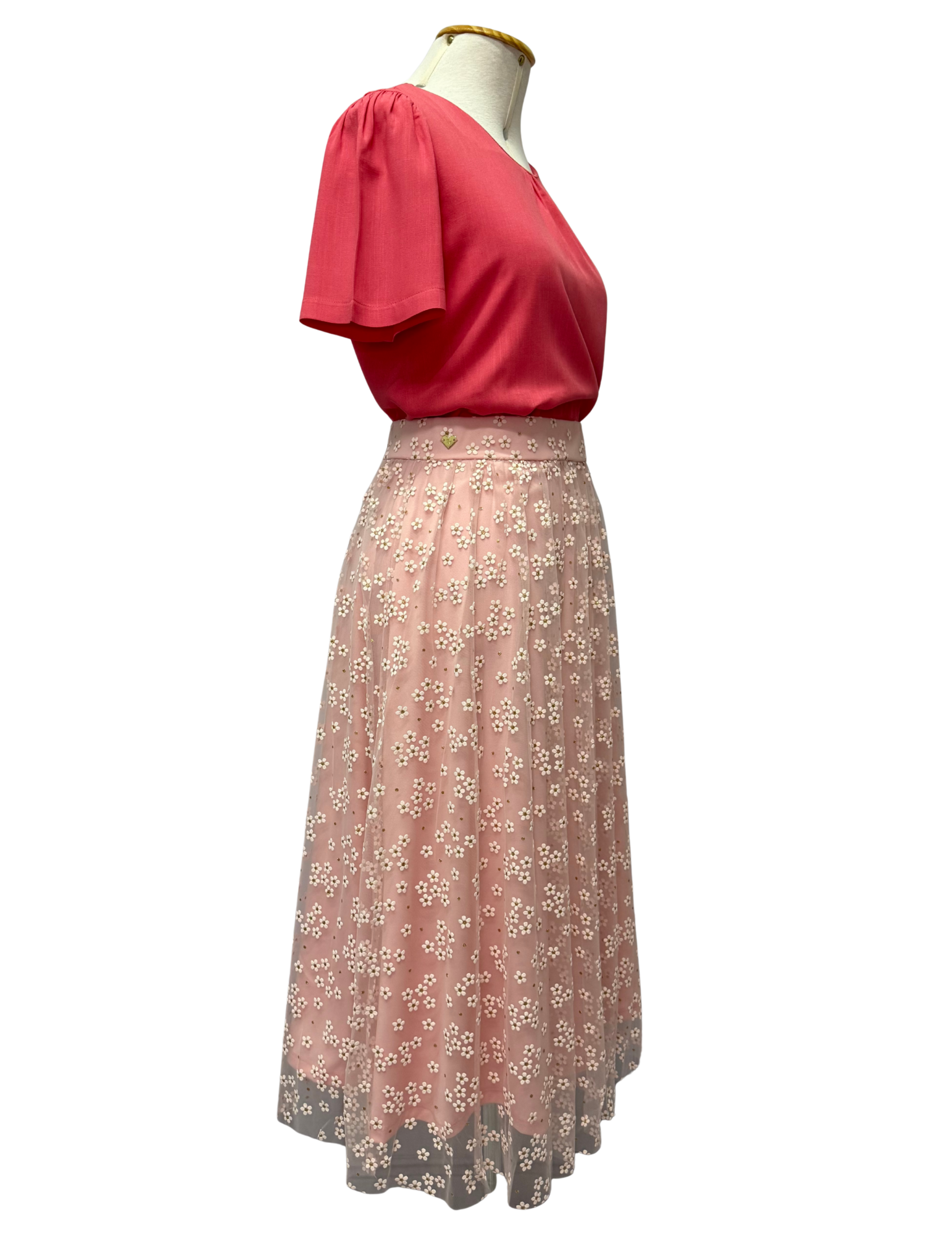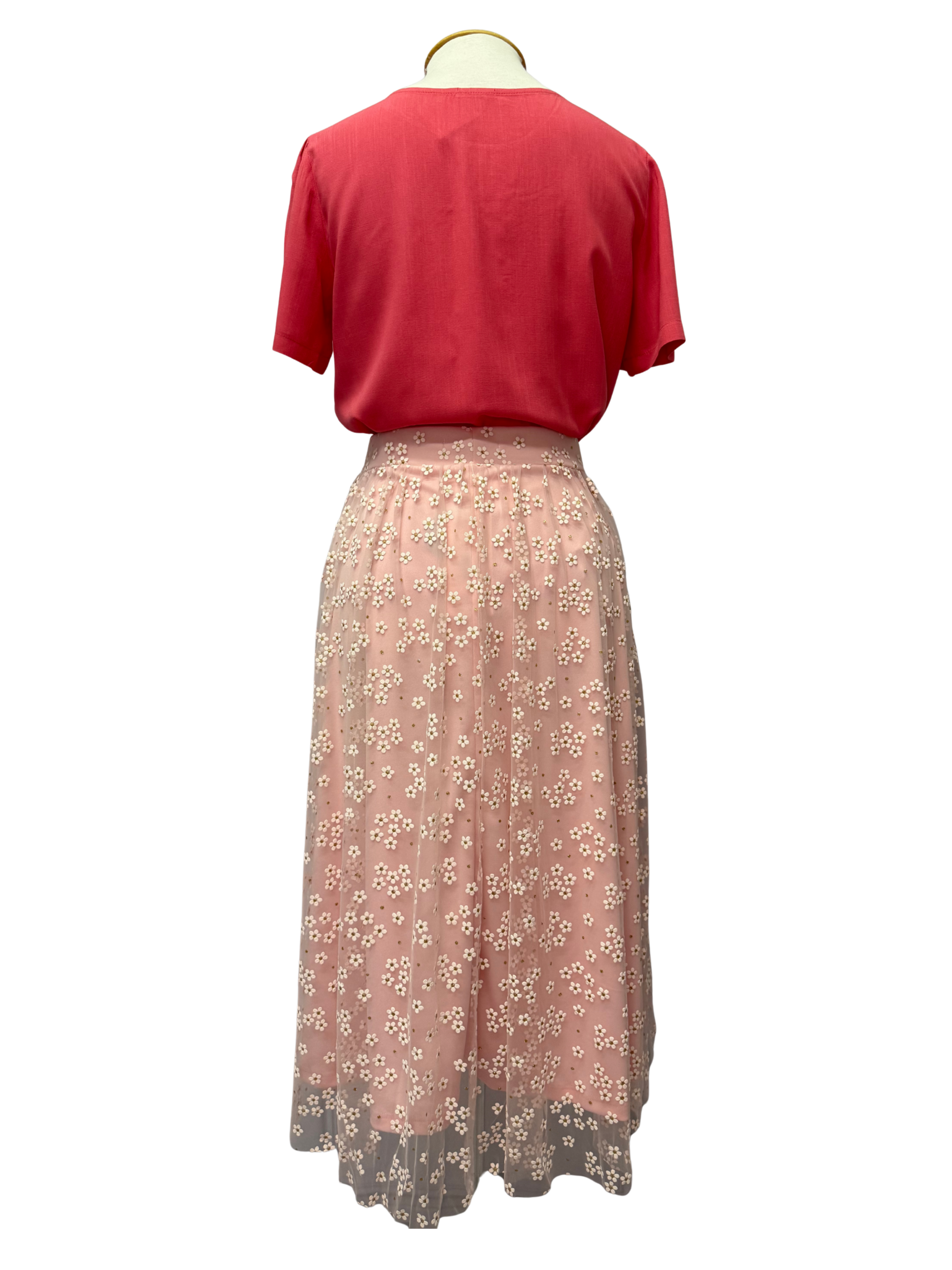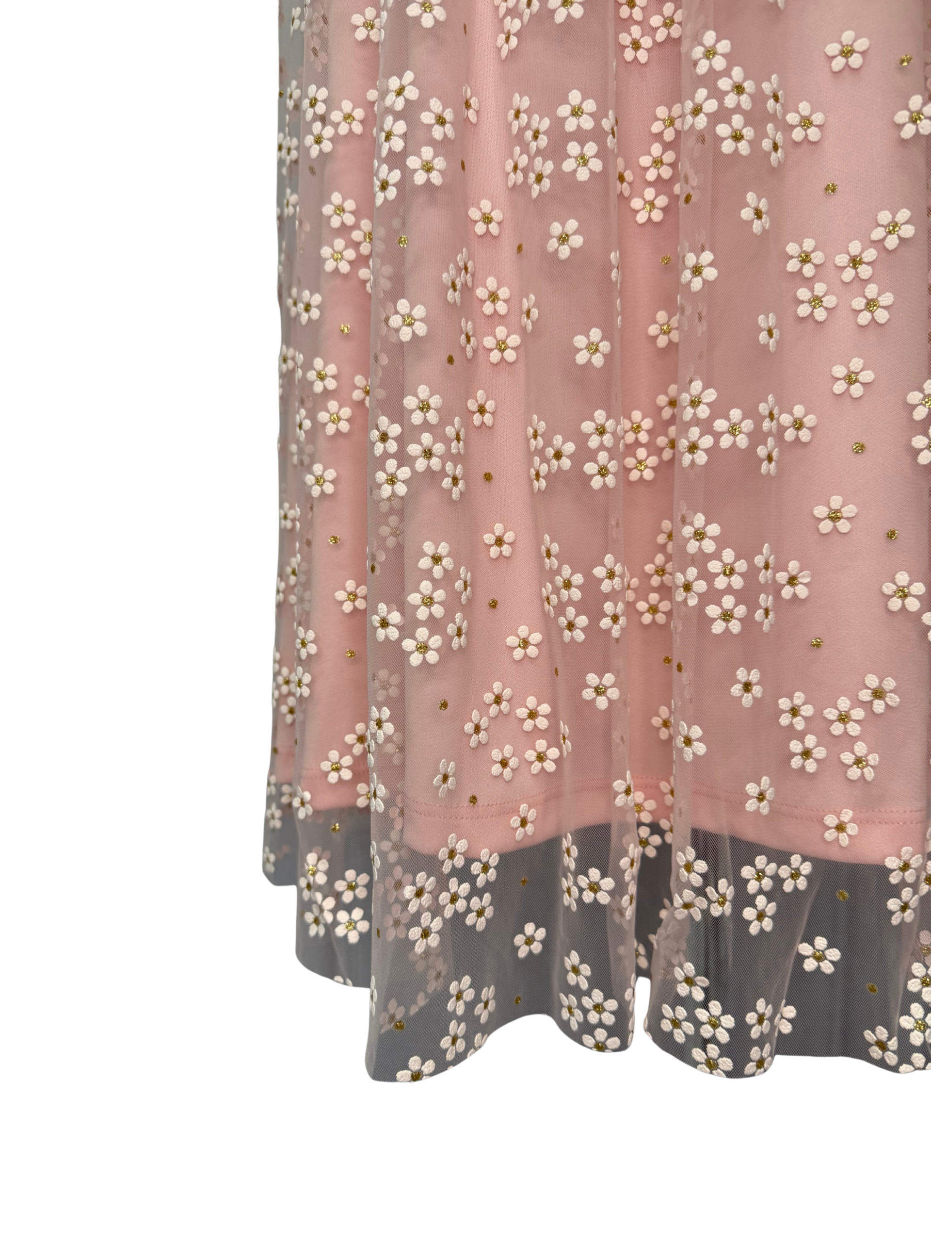 Com forro rosa claro e uma camada superior de tule transparente, a peça é rica em bordados de pequenas flores brancas e detalhes dourados sutis, proporcionando um visual romântico e elegante. O cós estruturado de elástico, valoriza a silhueta, enquanto o caimento leve garante movimento e fluidez.